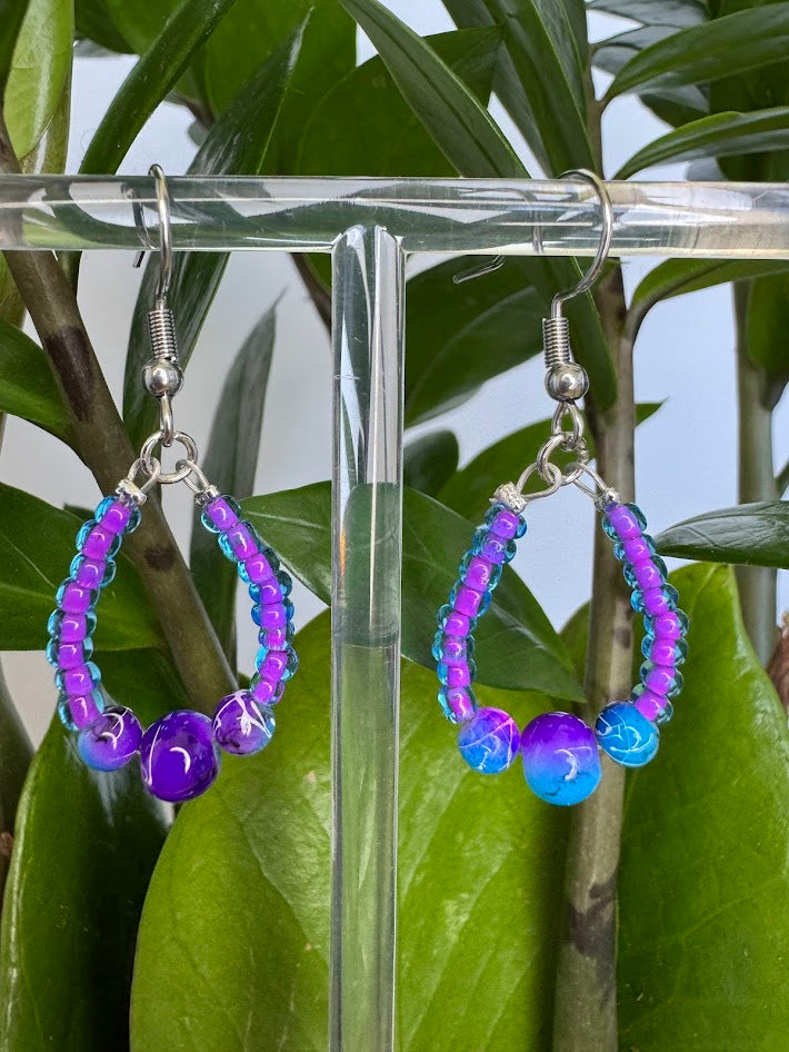 This set feature 2mm purple lined blue glass seed beads. They feature 4 and 6mm pink, purple and blue marble crackle glass beads. Finished using flexi wire and stainless-steel hook earring findings.